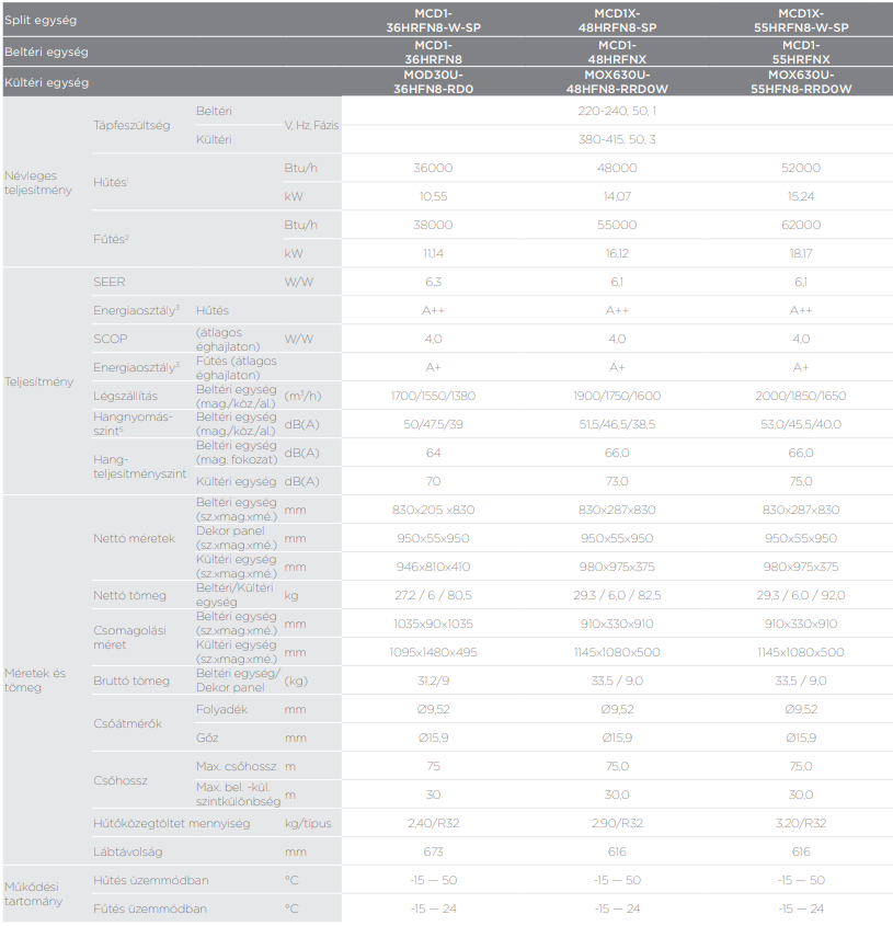 A Midea MCD1-36HRFN8-W-SP kazettás split (R32, 10,6 kW, breezeless funkcióval) fontos tulajdonságai: