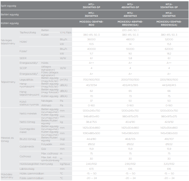 A Midea MTJI-55HWFNX-SP légcsatornázható split (R32, 16 kW) fontos tulajdonságai: