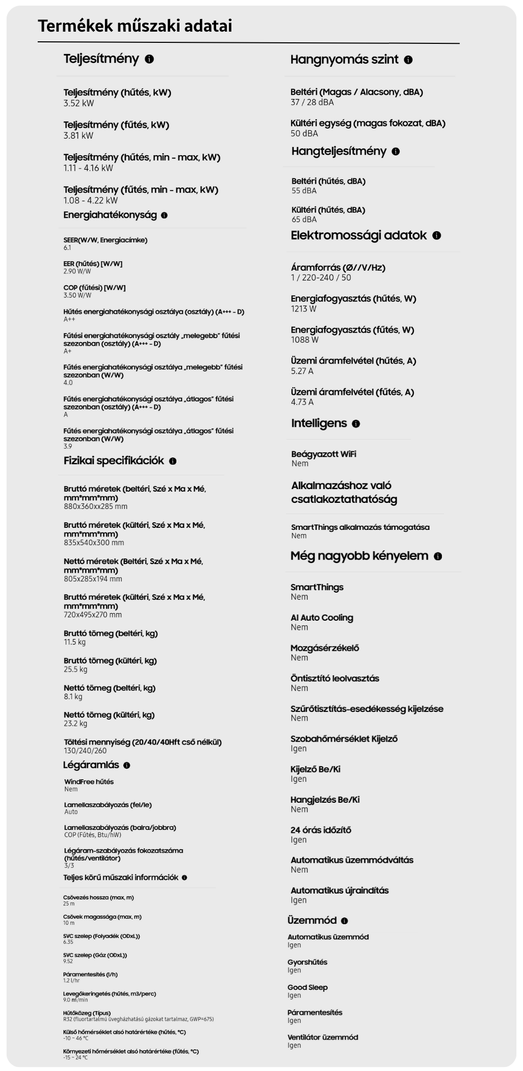 - Hűtő teljesítmény : 3,5 kW